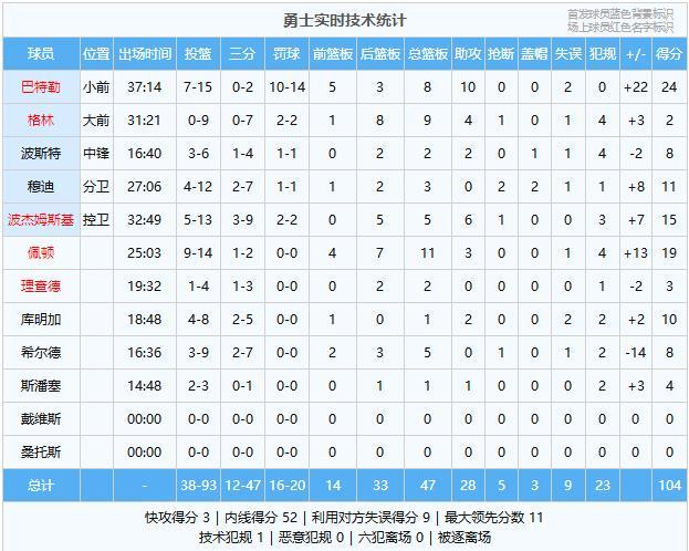 勇士数据:巴特勒24分8板10助、佩顿19分11板3助、波杰姆斯基15分5板6助、穆迪11分3板2断2帽、库明加10分1板2助、希尔德8分5板、波斯特8分2板2助、斯潘塞4分1板1助、理查德3分2板、格林2分9板4助